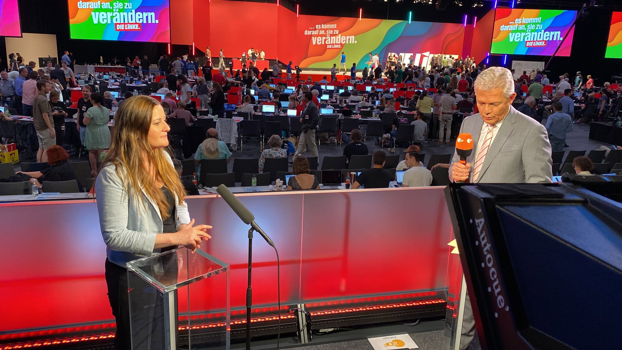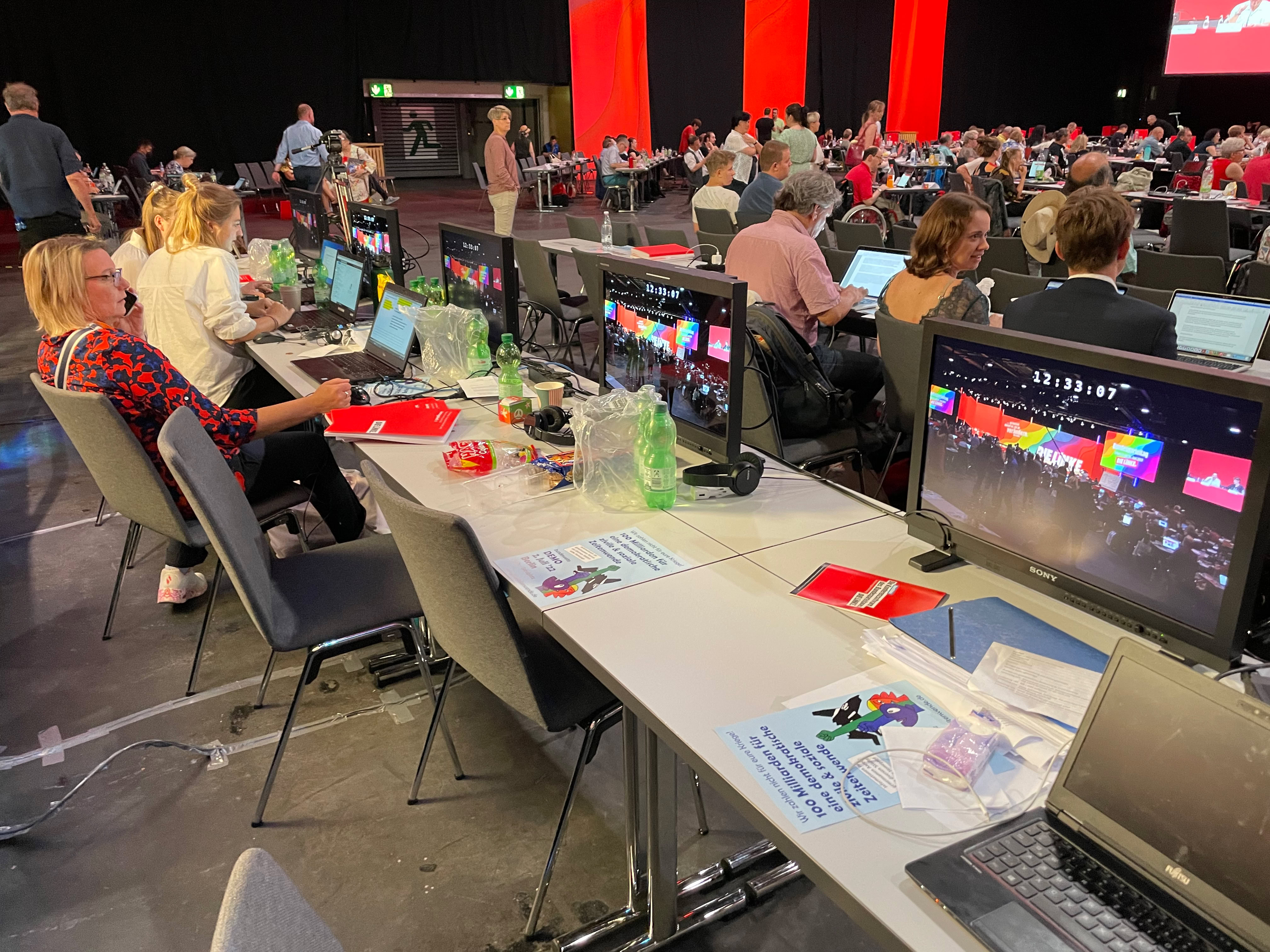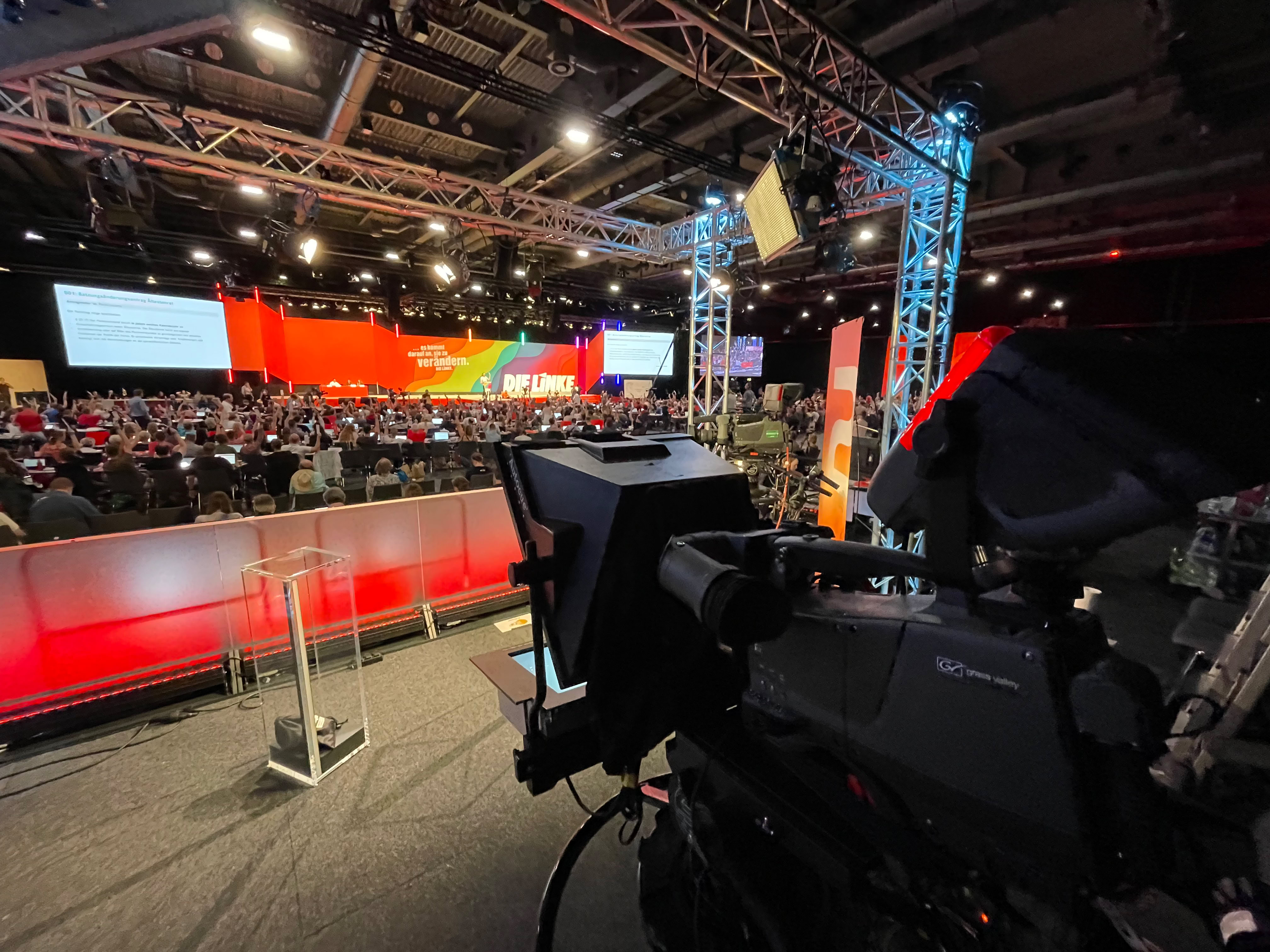Für das ZDF waren wir Ende Juni mit zwei Kameras und zehn Beobachter-Plätzen beim Parteitag der Linken in Erfurt Vorort. Neben der aktuellen Berichterstattung haben wir auch die Sendung Standpunkte produziert. Beiträge vom AVID Schnittmobil des ZDF überspielt.