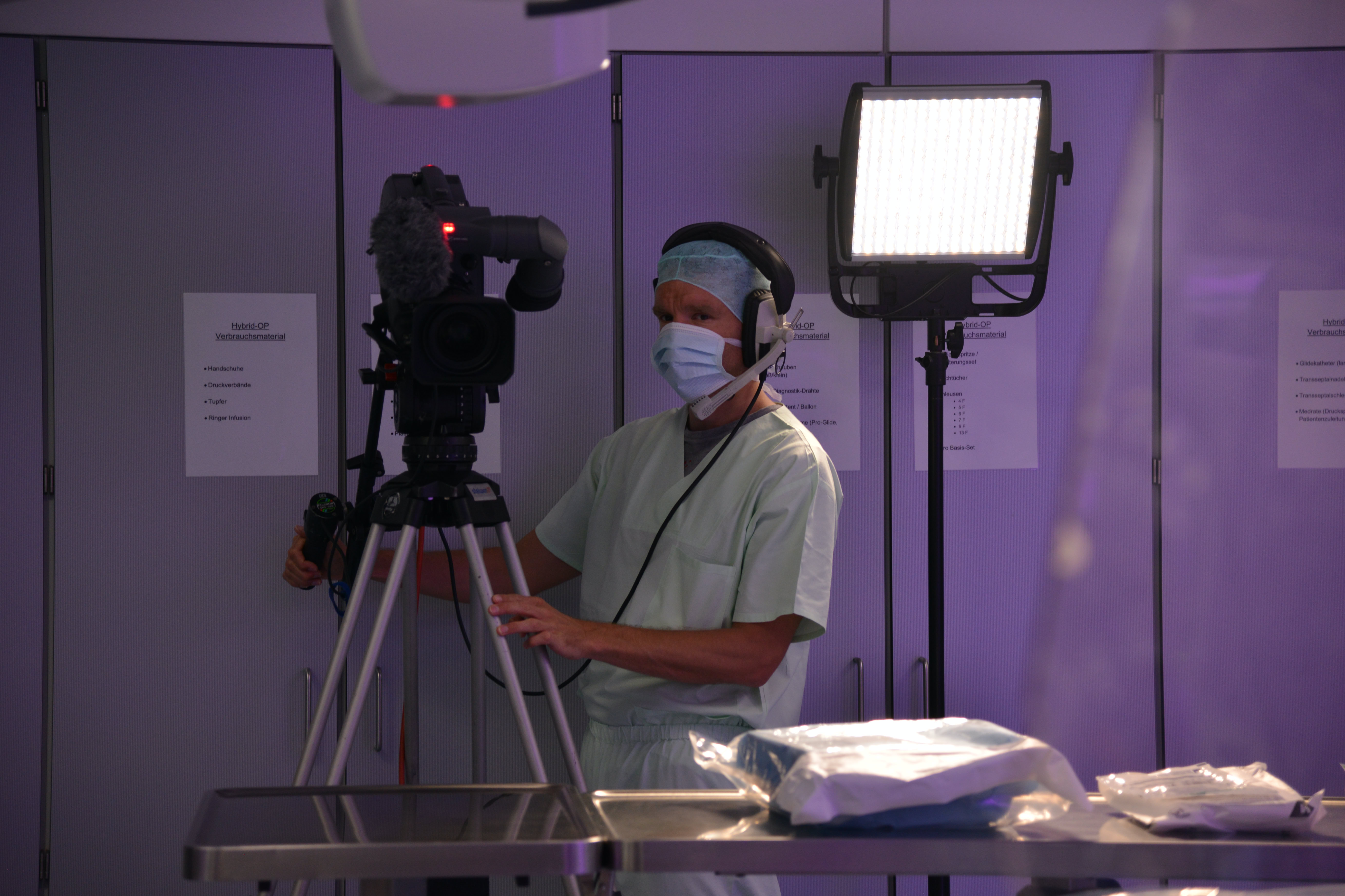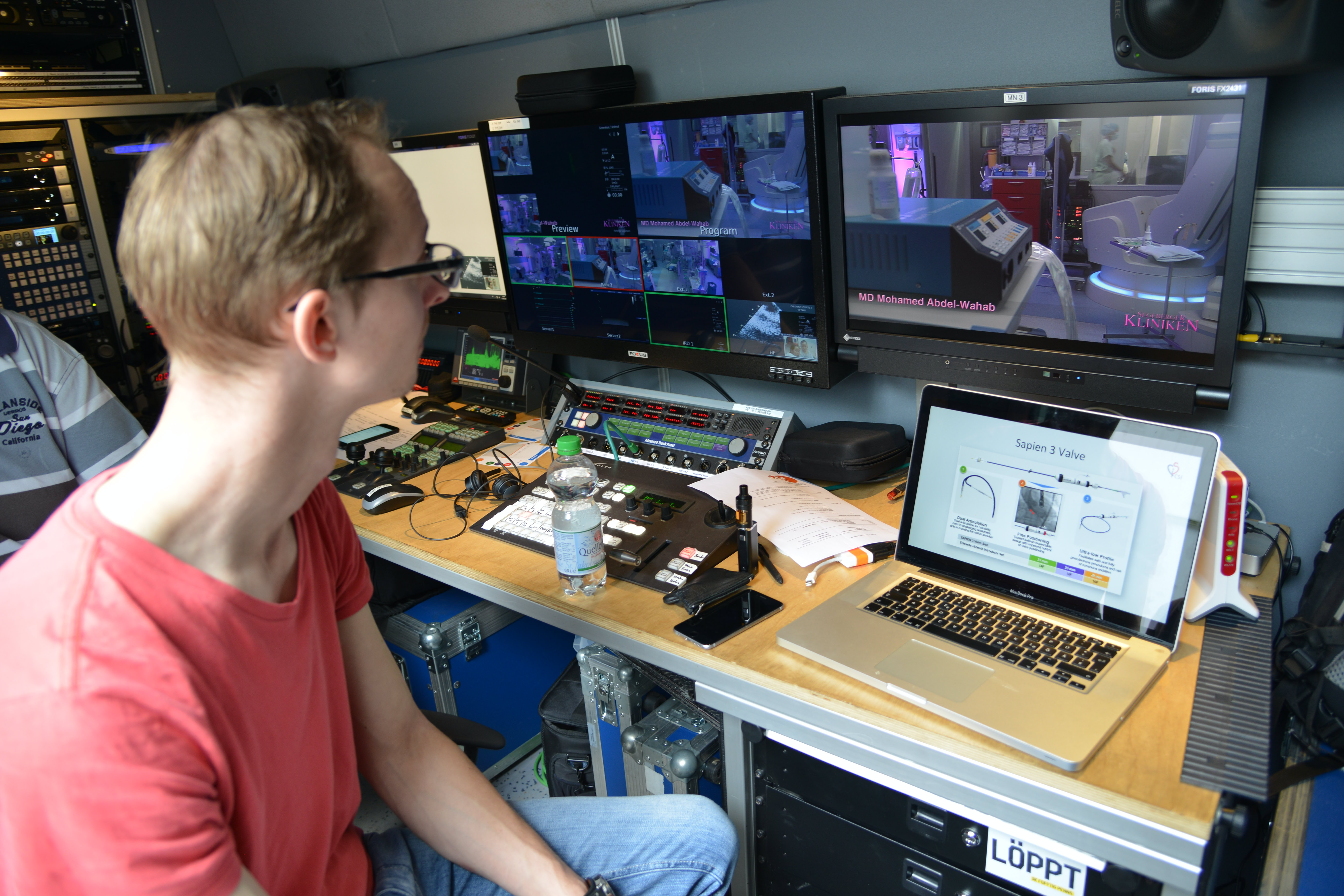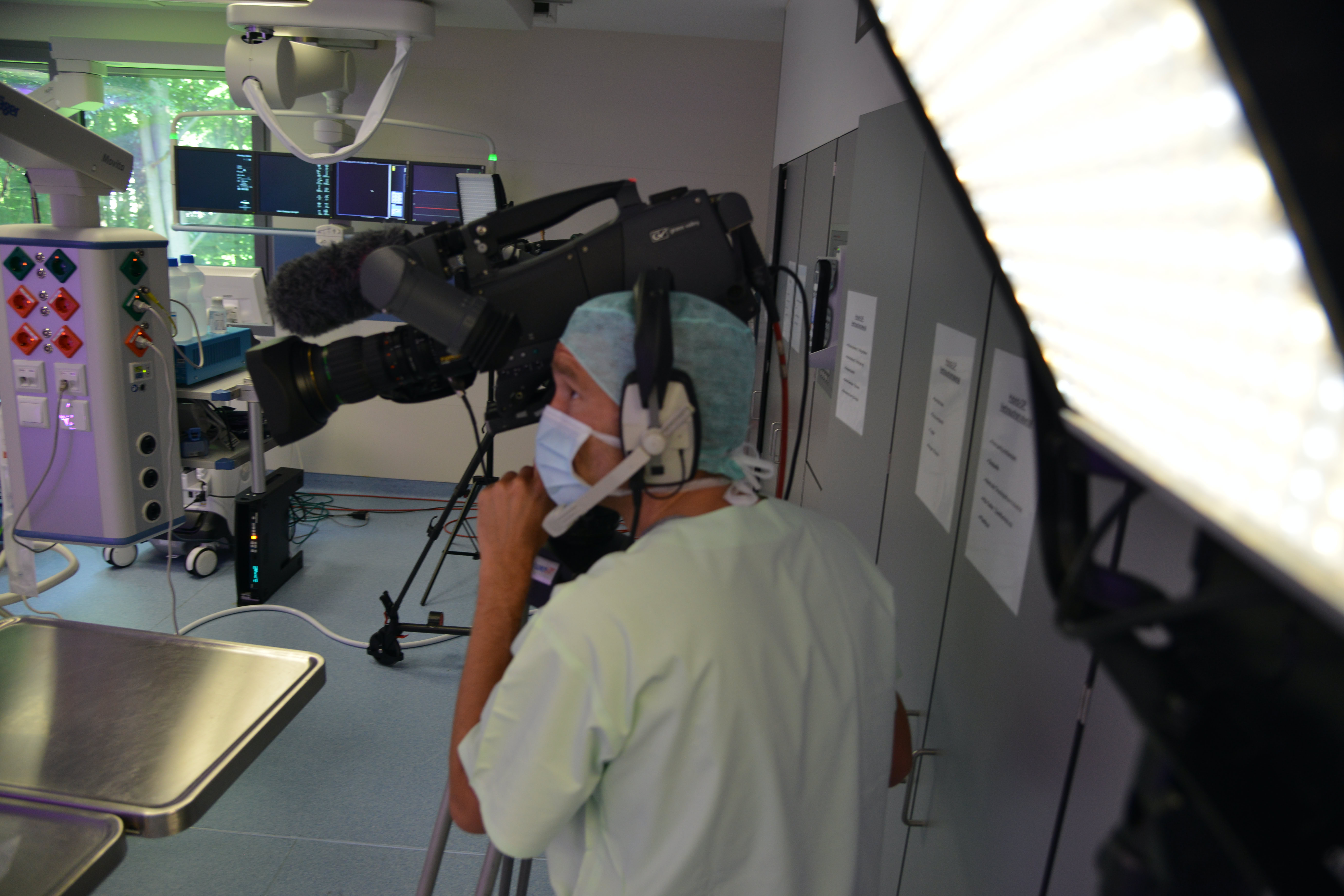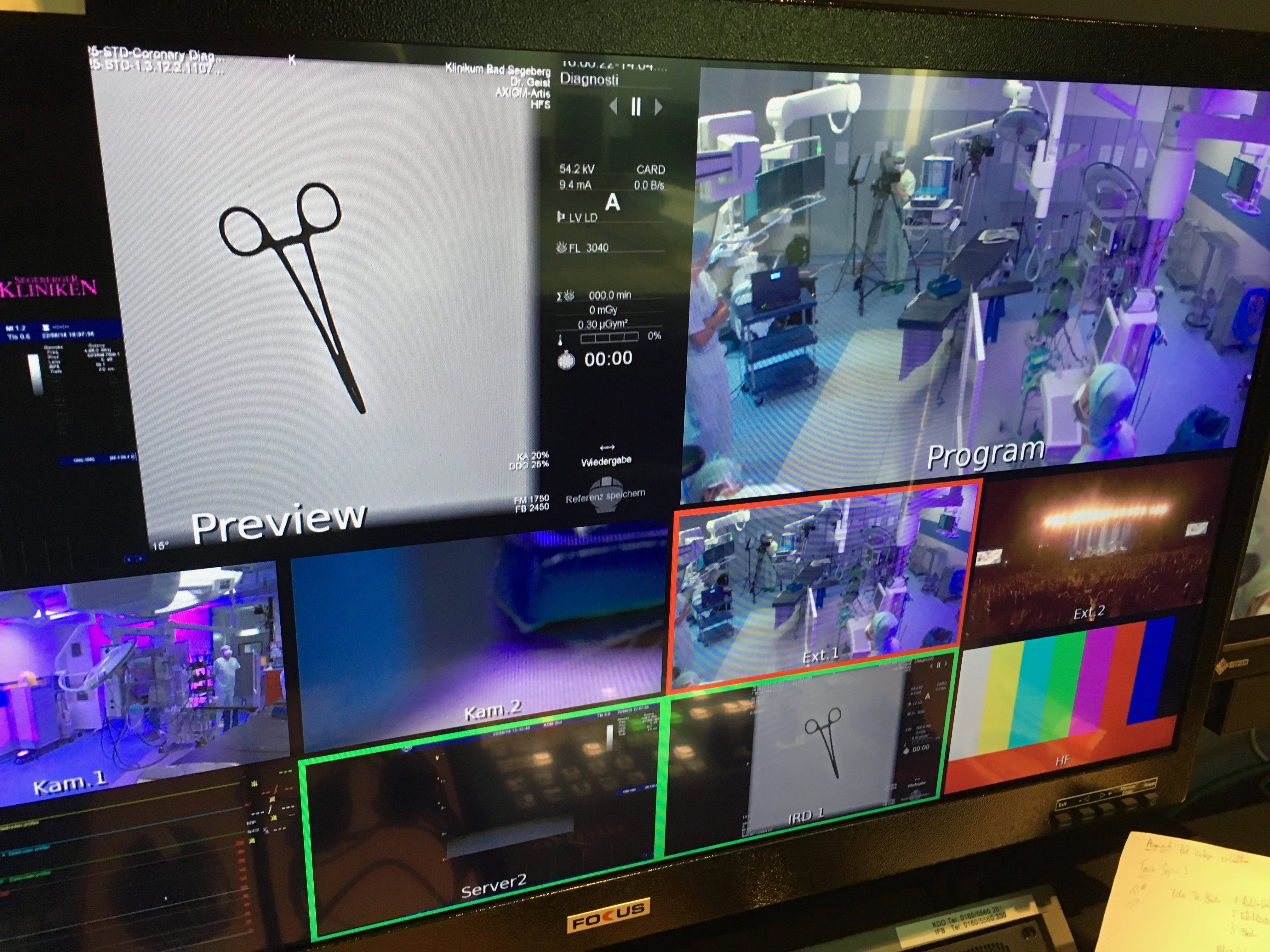 Zum einem die Übertragung aus dem Operationssaal mit Kameras und der Abnahme der medizinischen Geräte mit Scanconvertern und der Regieführung auf der SNG. Replay Zuspielung von Vorbereitungsphasen, Powerpoint-Präsentationen der Fälle und auch Bauchbinden für die Mediziner vor der Kamera. Mit moderner Glasfasertechnik, wie dem Riedel Mediornet minimieren wir den Verkabelungsaufwand zwischen dem Operationssaal und der Regie in der SNG.